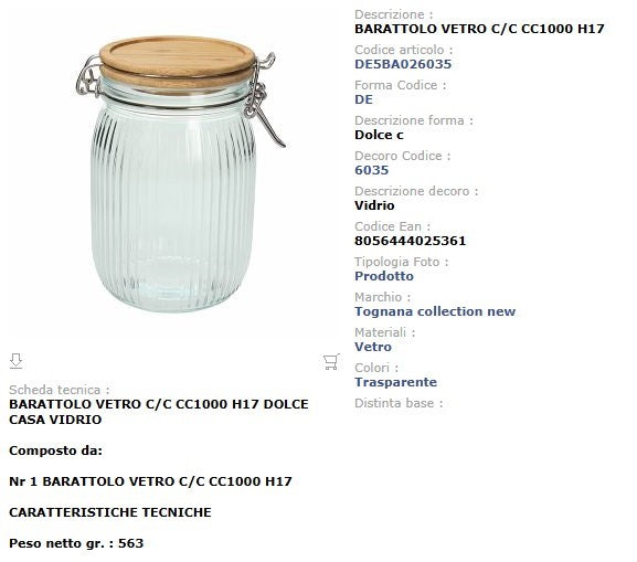 Il barattolo con coperchio da 1000 cc della linea Vidro di Tognana è l'accessorio perfetto per organizzare la tua cucina con stile naturale. Con un'altezza di 17 cm e materiali di qualità, questo barattolo combina funzionalità ed estetica.